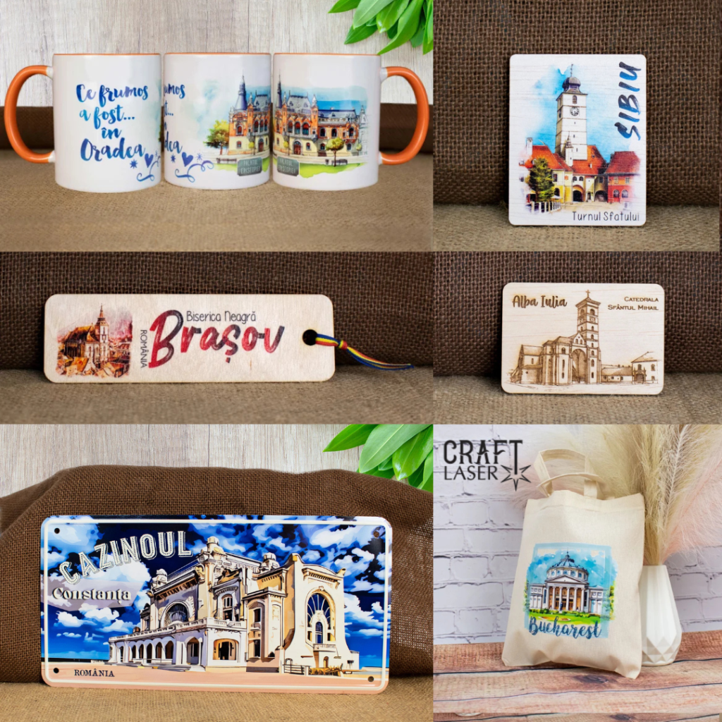 Am navigat în magazinul online Craftlaser și am ales câteva imagini care să te inspire: de la celebrii magneți de frigider plini de culoare și istorie, la căni cu mesaje de suflet, tablouri metalice grăitoare și mult apreciatele sacoșe suvenir.